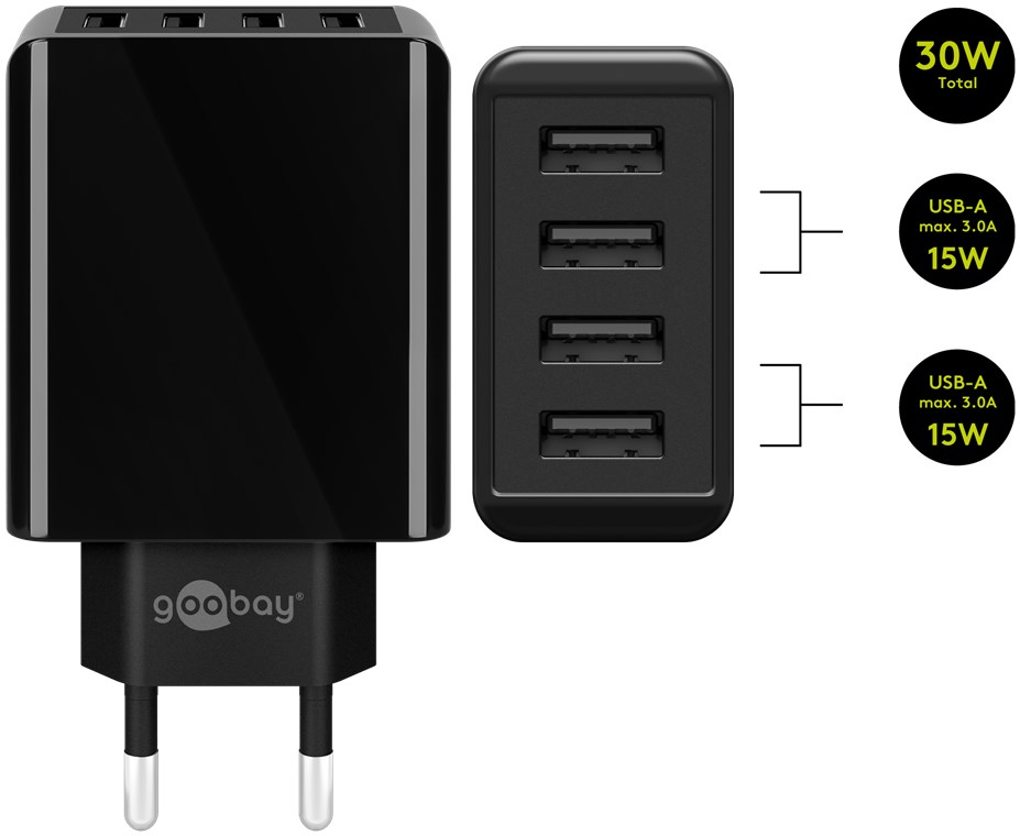 - Wystarczająca ilość połączeń w każdej chwili. Ładuje do 4 urządzeń jednocześnie przez USB-A