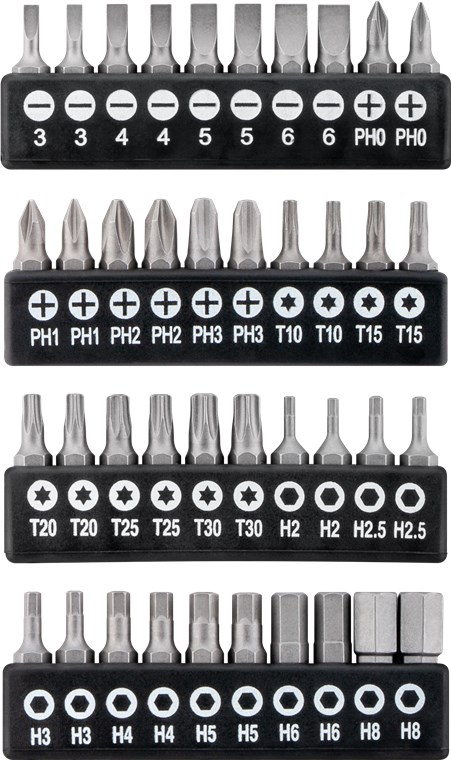 10 bitów torx: T10, T10, T15, T15, T20, T20, T25, T25, T30, T30