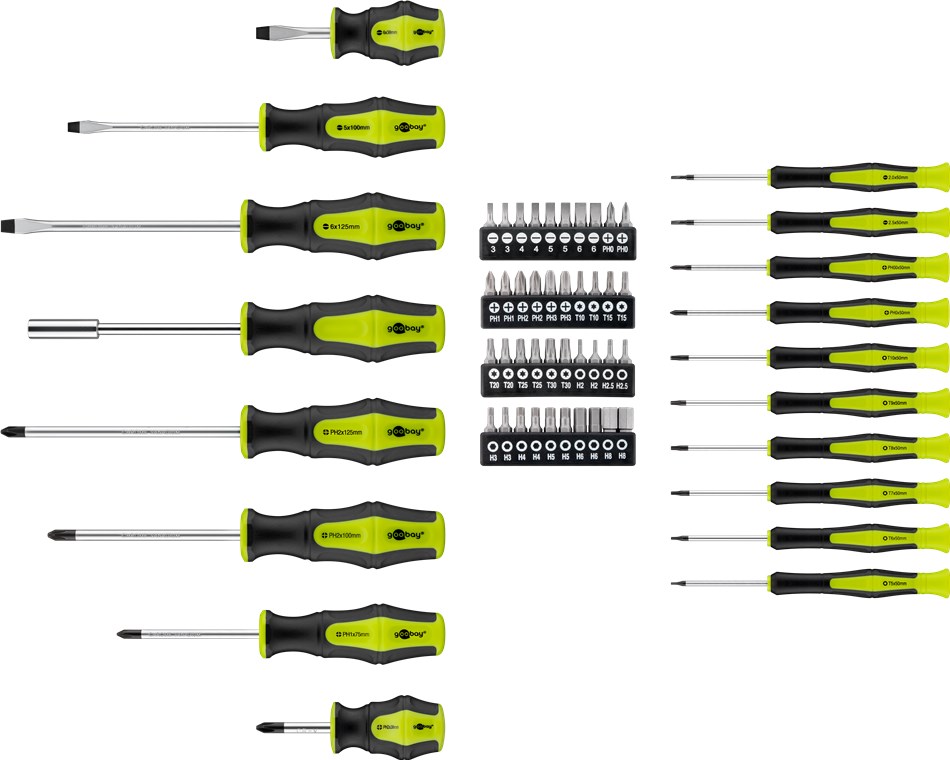 3 wkrętaki krzyżakowe: PH2 x 125 mm, PH2 x 100 mm, PH1 x 75 mm, PH2 x 38 mm