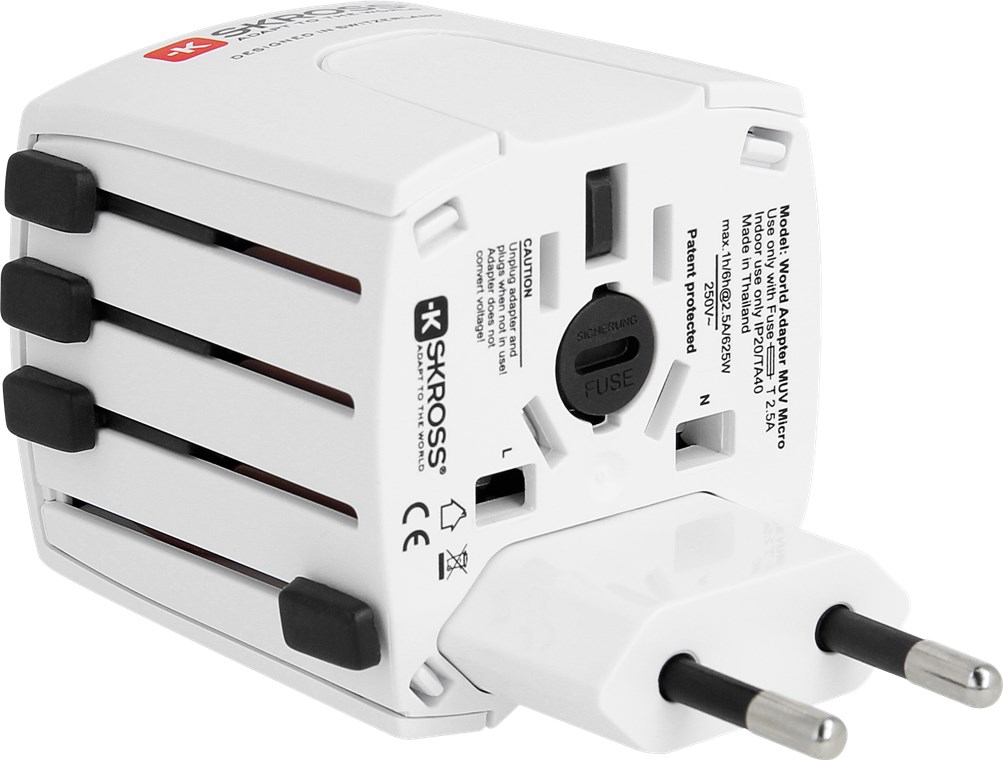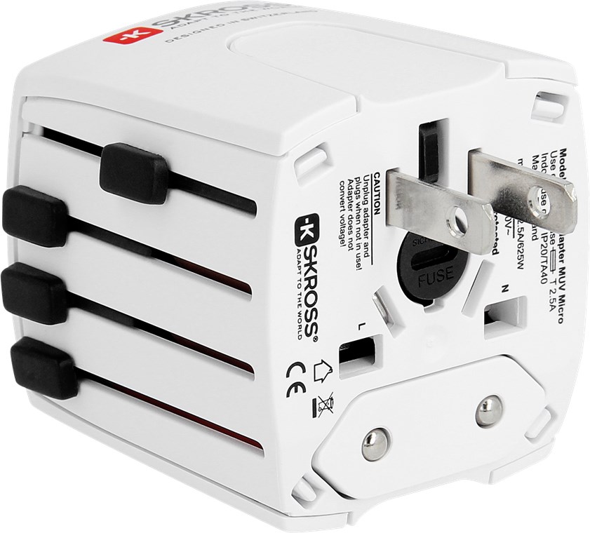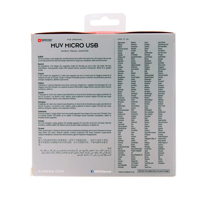 Kompaktowy adapter podróżny World MUV Micro USB umożliwia podróżującym łatwe podłączenie każdego nieuziemionego 2-pinowego urządzenia. Ponadto oferuje nakładaną i wysokowydajną ładowarkę USB. Ładowarka ma dwa porty USB i można ją użytkować także osobno we wszystkich krajach z gniazdami w standardzie amerykańskim.