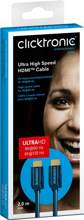 Zaprojektowany, aby doświadczyć przyszłości już dziś! Kabel Clicktronic Ultra High Speed HDMI™ zapewnia niezwykle ostry obraz, oszałamiająco naturalne i najszybsze dostępne prędkości transmisji. Dzięki czystym materiałom, precyzyjnemu wykończeniu i najnowocześniejszej technologii połączy Twój telewizor z innymi urządzeniami i Internetem.