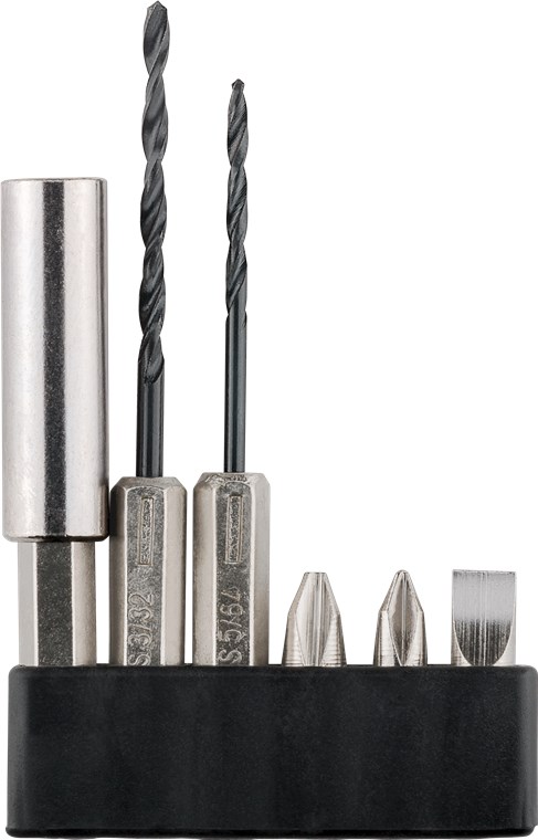 - w zestawie 3 bity CrV 25 mm, 1 rozszerzenie bitowe, 2 wiertarka oraz 5/64 (2 mm), 3/32 (2,5 mm) i ładowarka sieciowa