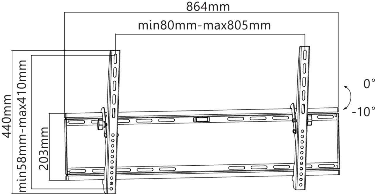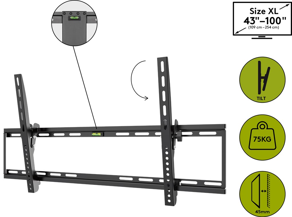 Przechylanie TV ścienny dla każdego 43 do 100 cali (109-254 cm) telewizor z aż do 75 kg. Może ona być odchylana od 0 ° do 10 °. Super płaska konstrukcja jest tylko 45 mm od ściany i uzupełnia elegancki wygląd ultracienkich telewizorów. Charakteryzuje się ona w otwartej konstrukcji, który maksymalizuje powietrza do urządzeń i pozwala na łatwy dostęp do tylnej części składowych. Telewizor można przesuwać w lewo i prawo na płycie ściennej, aby ustawić ją dokładnie.
