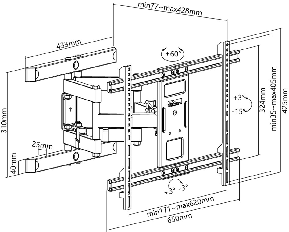 - Uchwyt ścienny utrzymuje telewizor w pozycji z zaledwie 77mm elegancko płaskim i oszczędzającym miejsce na ścianie i może być przedłużony do 428mm w celu uzyskania optymalnego kąta widzenia.